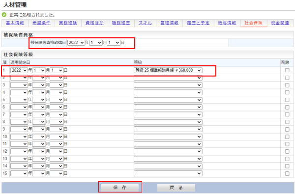 A被保険者資格取得日を設定し「適用開始日」と「等級」を設定して保存します。
