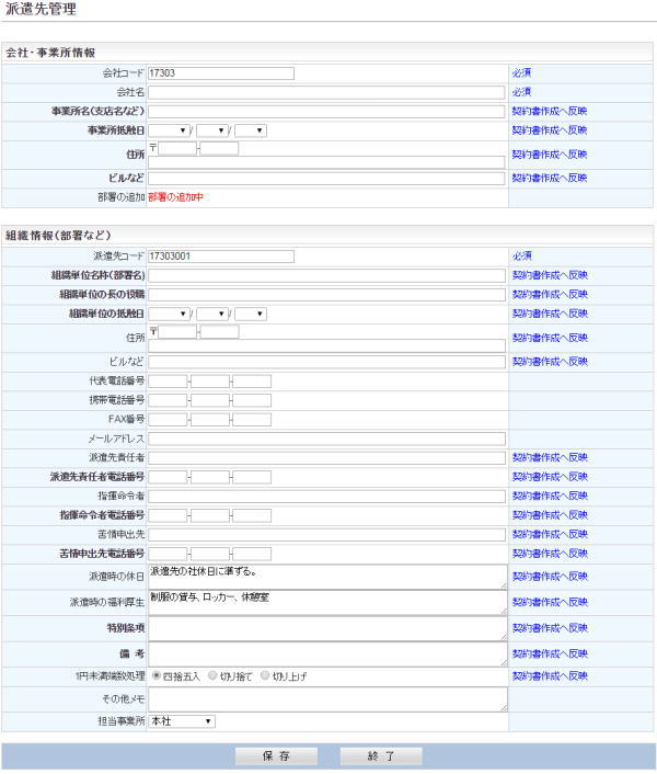 「部署の追加」(青文字)をクリックしまと新しい「派遣先コード」が自動振りされ、住所・電話番号や一部の内容が元のデータを引き継いだ空欄の項目の画面が表示されますので、契約書を作成時に必要な項目すべてを入力設定し保存してください。