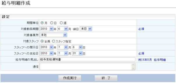 | 開示日 | 「ウェブ勤怠管理」をご利用頂いている場合に、給与明細をスタッフマイページに開示する日付です。 「ウェブ勤怠管理」をご利用ではない場合は、支給日と同日にしてください。 デフォルトは作成当日です。 |
