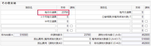 | 給与総額 | ・賃金+日払交通費+半年交通費+立替精算+その他支給 (雇用保険計算用でデータとしては持ちません) |