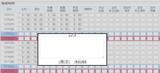 | 手動残業計算 | 自動残業計算なし。 「就業時間」と「所定時間」は、「出社時間」「退社時間」「休憩時間」から自動計算 される。 残業時間を入力すると「所定時間」から残業時間分マイナスされる。 |